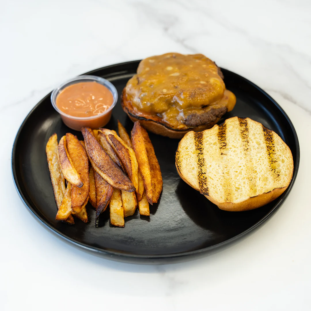 This high-protein meal features a juicy 90/10 grass-fed beef patty topped with ketchup and mustard, all stacked on a toasted white bun. On the side: seasoned, baked Idaho fries for a satisfying, balanced bite. It’s everything you crave, with the macros you’re looking for.
